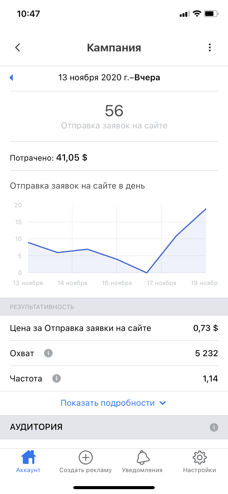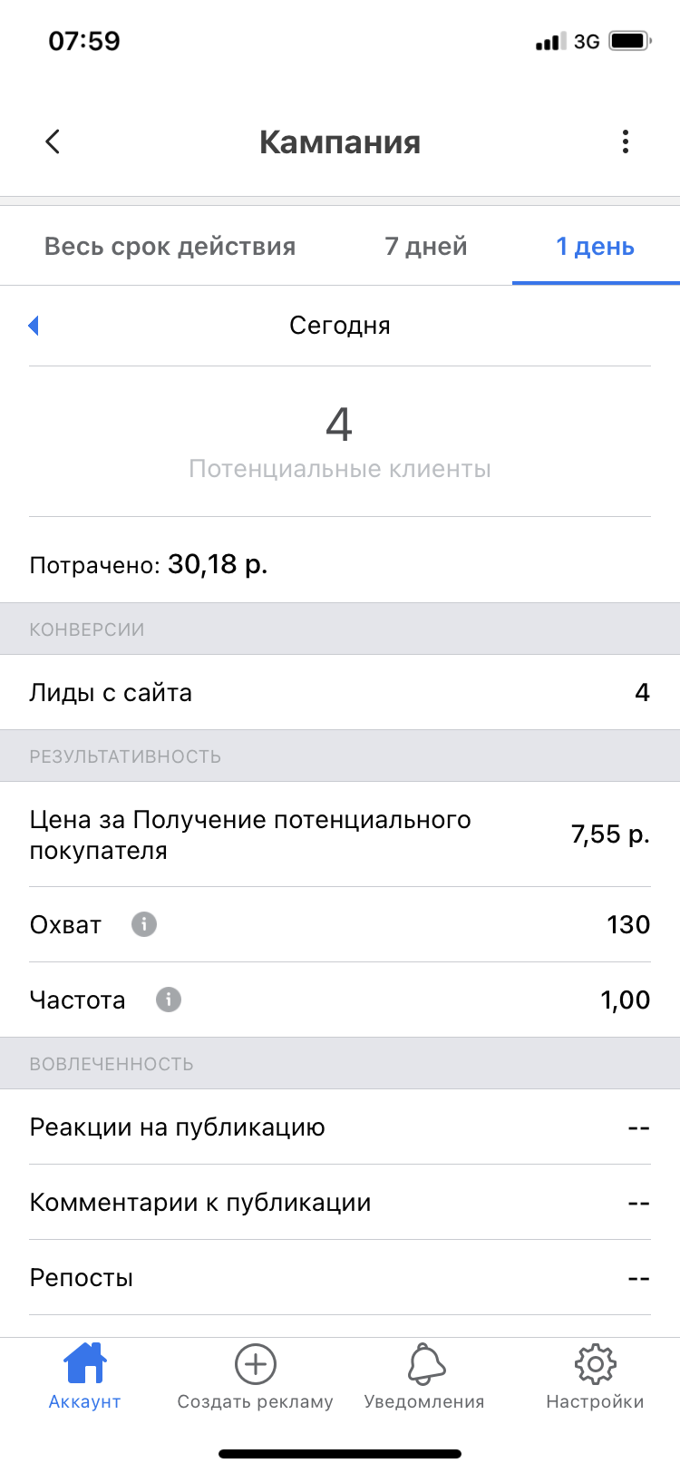 Следим за результатами каждой кампании и стоимостью заявки. Не делайте поспешных выводов в первые дни. Даже если какая-то кампания даёт дорогие заявки, то не спешите её отключать. Часто стоимость выравнивается в течение 7-10 дней. Если через 10 дней стоимость заявок в одной из кампаний остаётся высокой, то отключайте этот креатив, видимо он не зашёл аудитории.